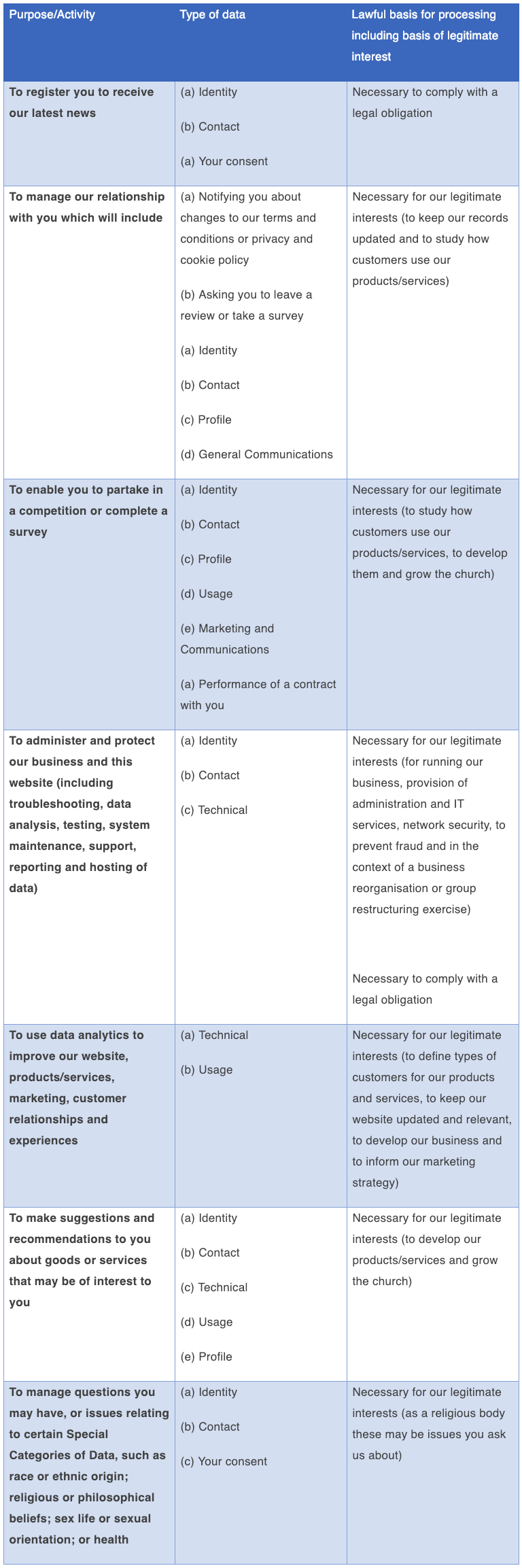Processing these types of Special Categories of Personal Data is permitted under data protection law where data subjects have given explicit consent and, or, where it is carried out by a religious entity in the course of its legitimate activity.